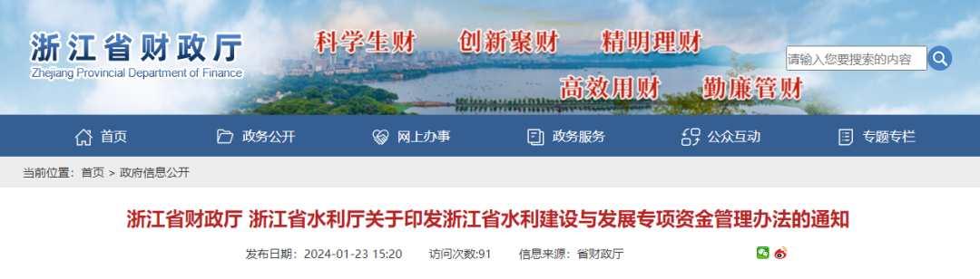 近日,浙江省財政廳發(fā)布《關(guān)于印發(fā)浙江省水利建設(shè)與發(fā)展專項資金管理辦法的通知》。本辦法自2024年3月1日起施行。