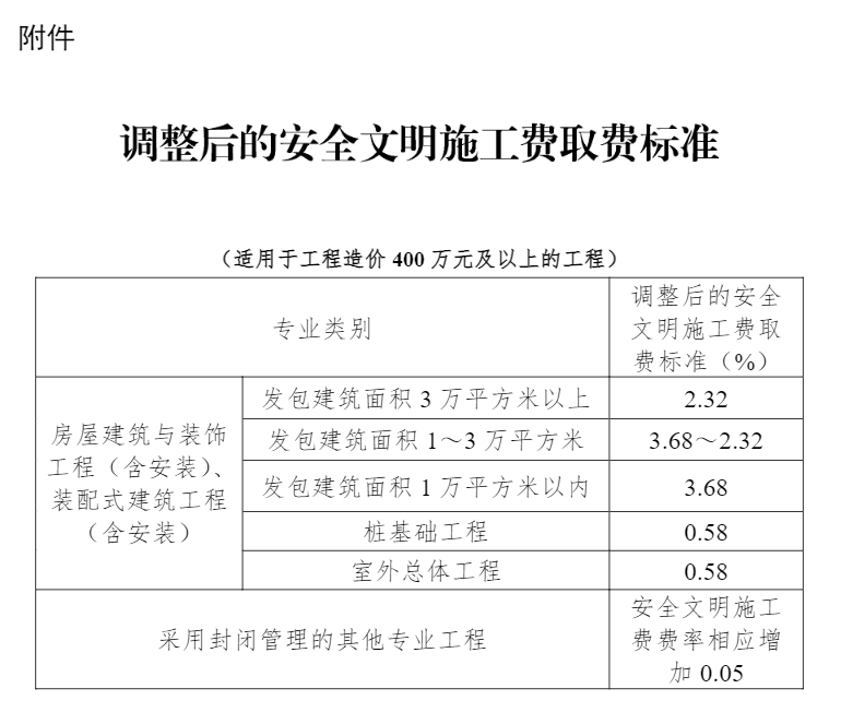 (一)工程造價400萬元及以上的房屋建筑與裝飾工程(含安裝)、裝配式建筑工程(含安裝)以及采用封閉管理的其他工程,其安全文明施工費費率相應增加0.05-0.1%。調(diào)整后的安全文明施工費取費標準詳見附件。新政 | 住建廳:發(fā)布計價依據(jù),400萬元及以上工程按本通知實施!