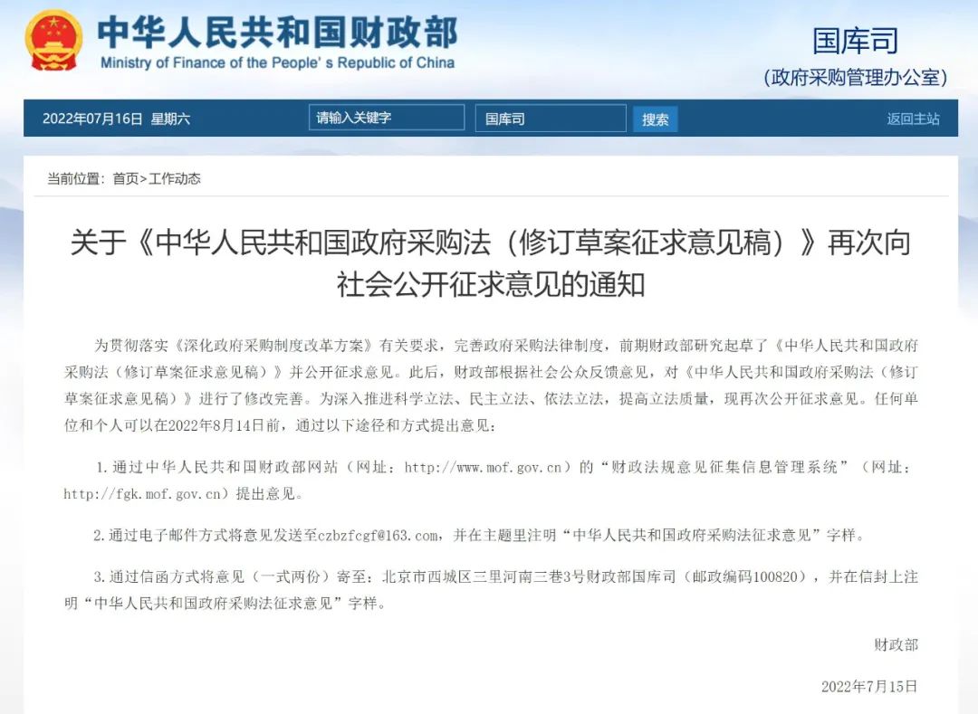 7月15日,財政部公布了新版的《中華人民共和國政府采購法(修訂草案征求意見稿)》(以下簡稱《意見稿》),《意見稿》與2003版《政府采購法》相差幾何呢?...