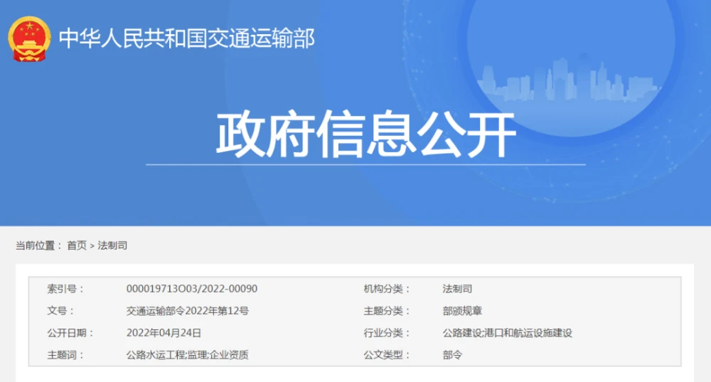 4月24日,交通運輸部官網(wǎng)發(fā)布《 公路水運工程監(jiān)理企業(yè)資質管理規(guī)定(中華人民共和國交通運輸部令2022年第12號)》, 自2022年6月1日起施行!