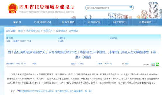 近日,四川省住建廳發(fā)布《關(guān)于公布房屋建筑和市政工程招標(biāo)文件中限制、排斥潛在投標(biāo)人行為典型事例(第一批)的通告》。