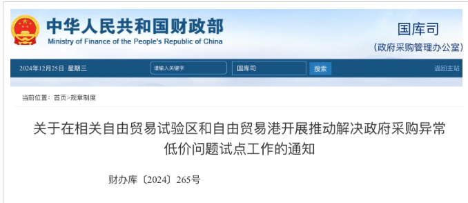 關(guān)于在相關(guān)自由貿(mào)易試驗區(qū)和自由貿(mào)易港開展推動解決政府采購異常低價問題試點工作的通知財辦庫〔2024〕265號 北京市財政局、天津市財政局、上海市財政局、福建省財政廳、...
