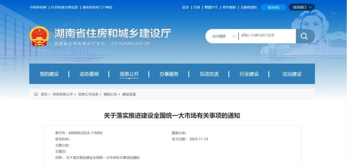 近日,湖南省住房和城鄉(xiāng)建設(shè)廳發(fā)布《湖南省住房和城鄉(xiāng)建設(shè)廳關(guān)于落實(shí)推進(jìn)建設(shè)全國(guó)統(tǒng)一大市場(chǎng)有關(guān)事項(xiàng)的通知》。