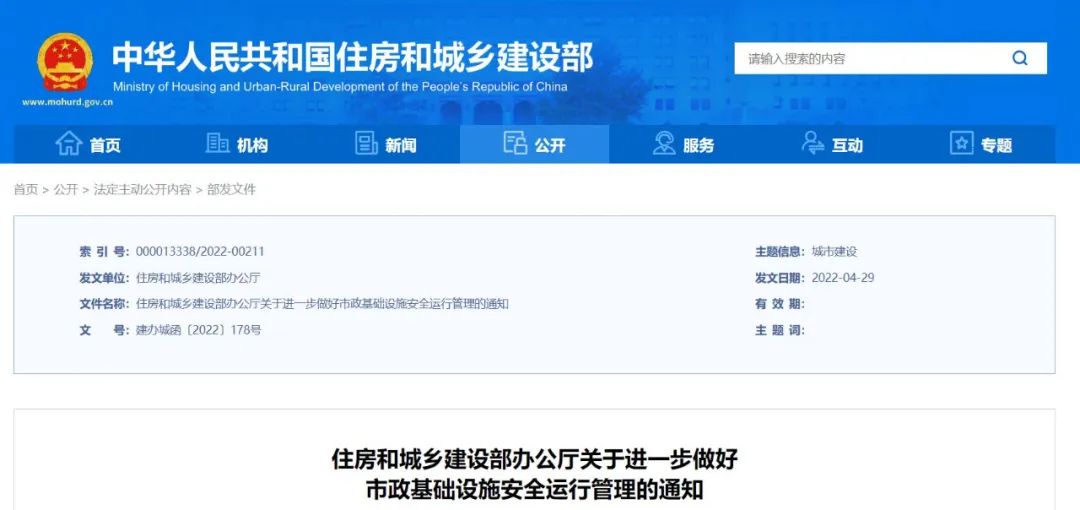 住房和城鄉(xiāng)建設(shè)部辦公廳通知要求進(jìn)一步做好市政基礎(chǔ)設(shè)施安全運(yùn)行管理工作為認(rèn)真貫徹落實(shí)習(xí)近平總書記關(guān)于安全生產(chǎn)的重要指示精神和黨中央、國(guó)務(wù)院決策部署,落實(shí)國(guó)務(wù)院安全生...